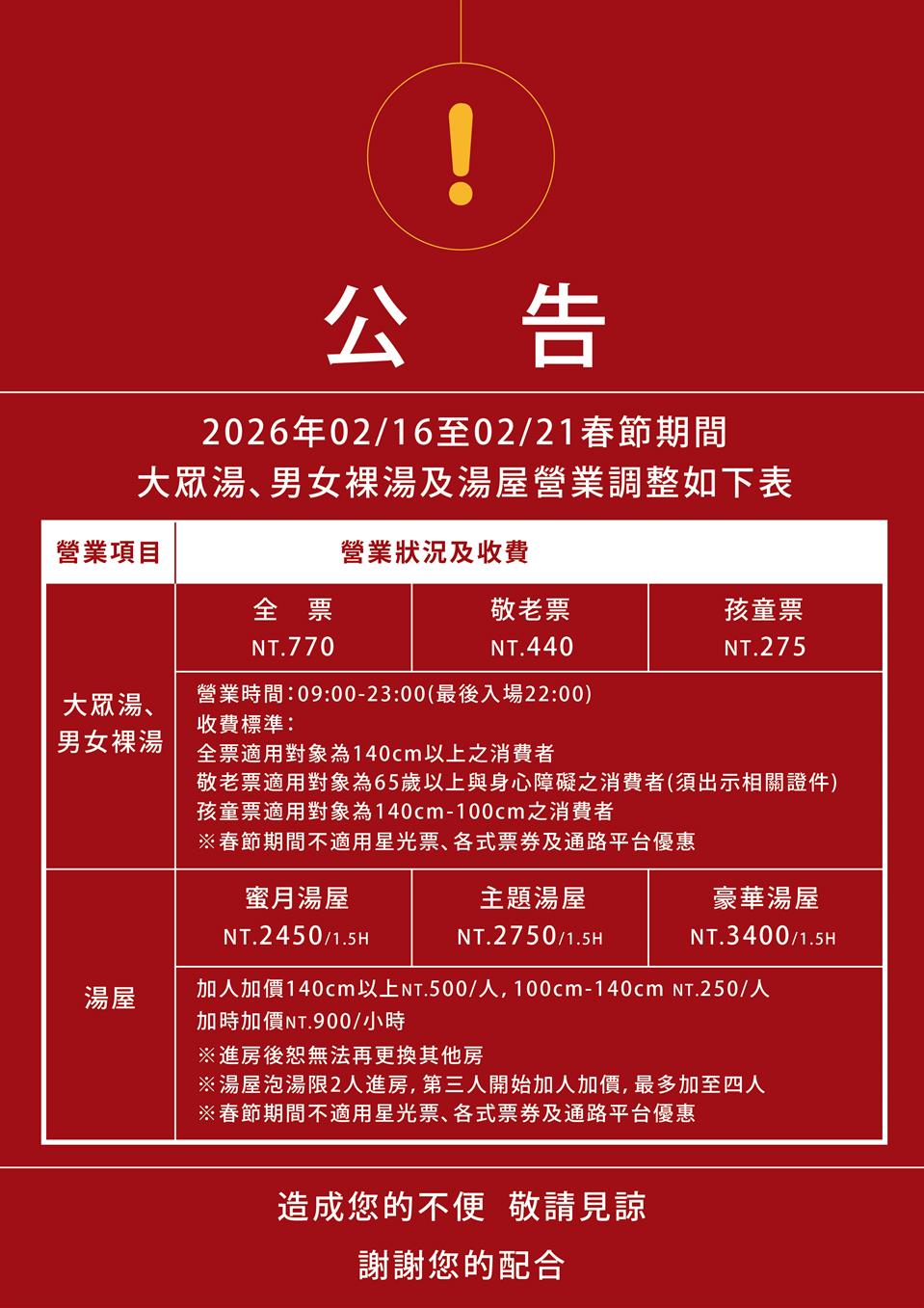 2026 春節期間戶外大眾湯及湯屋價格調整公告