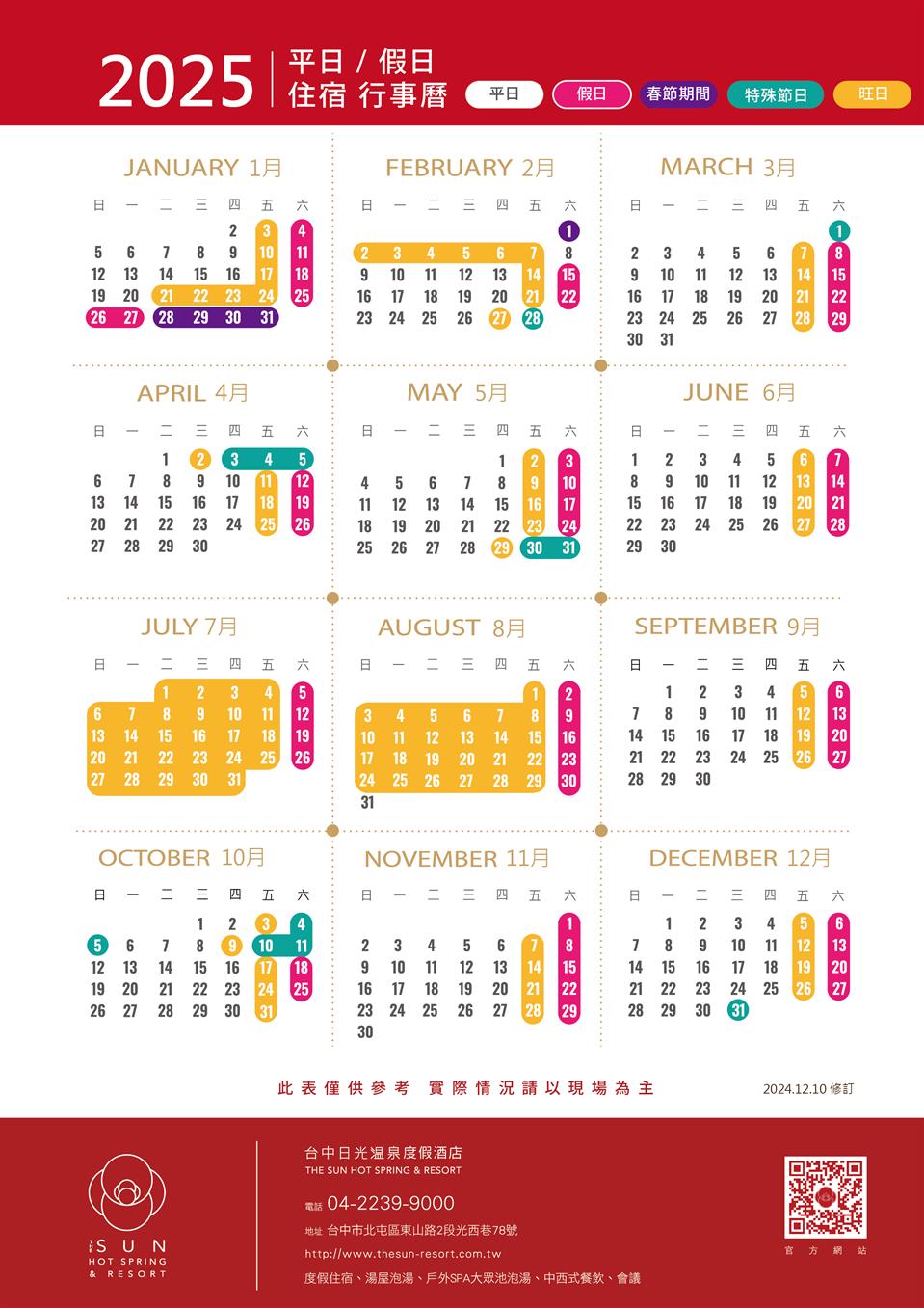 2025 住宿 平假日年度行事曆