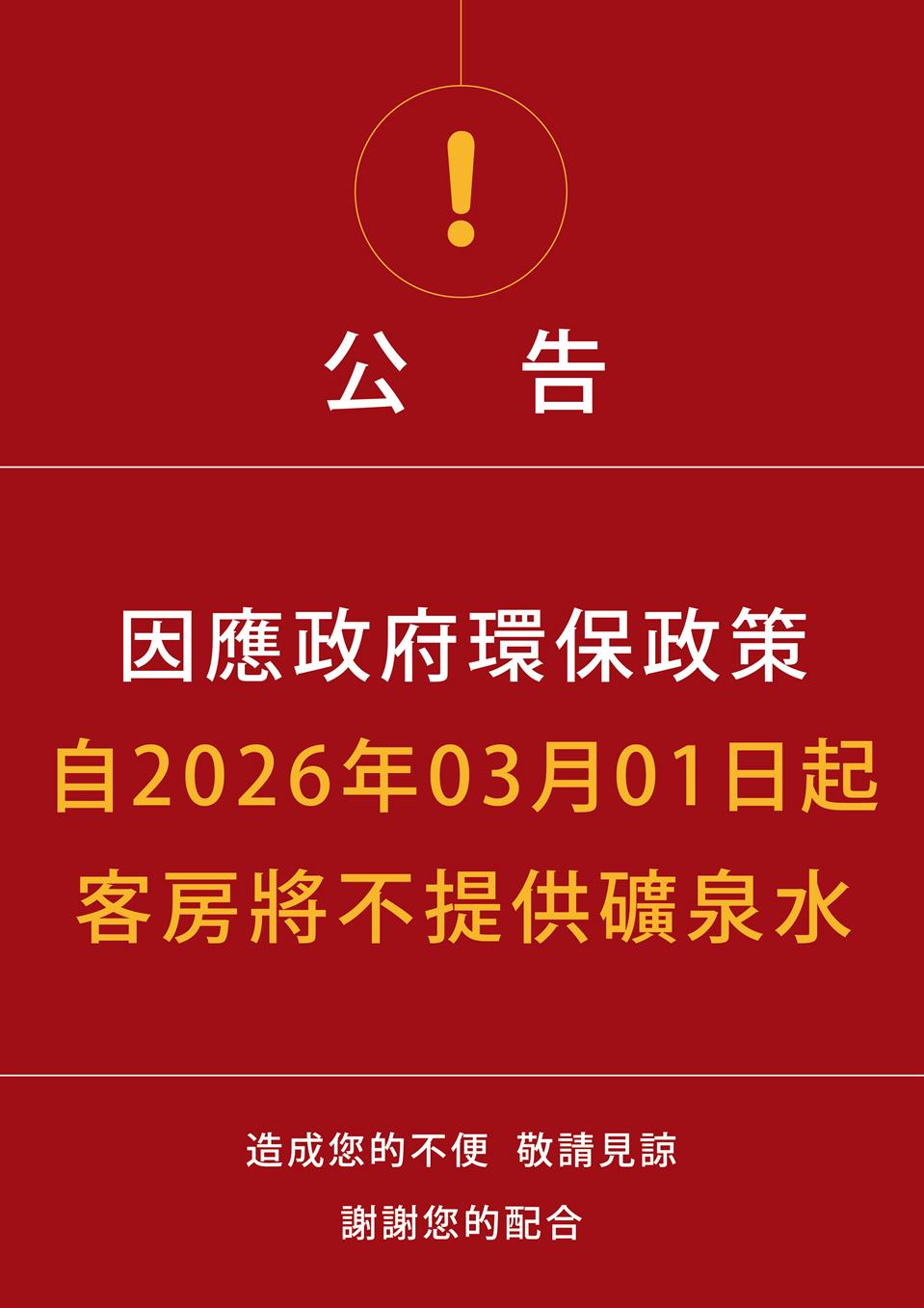 2026 3/1起客房將不提供礦泉水公告